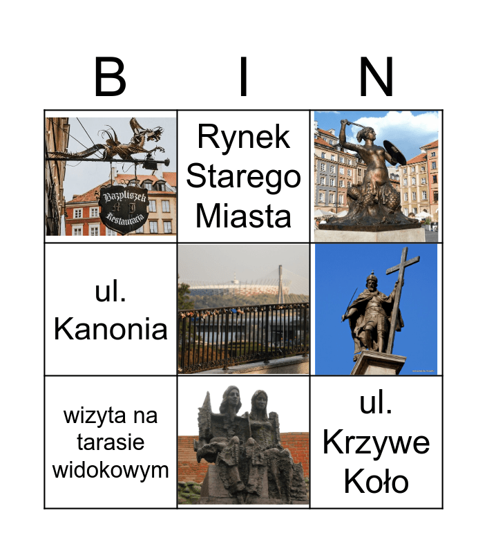 This bingo card has 9 images and 6 words: ul. Krzywe Koło, Gnojna Góra, ul. Kanonia, wizyta na tarasie widokowym, Rynek Starego Miasta and Książę Niedźwiedź.