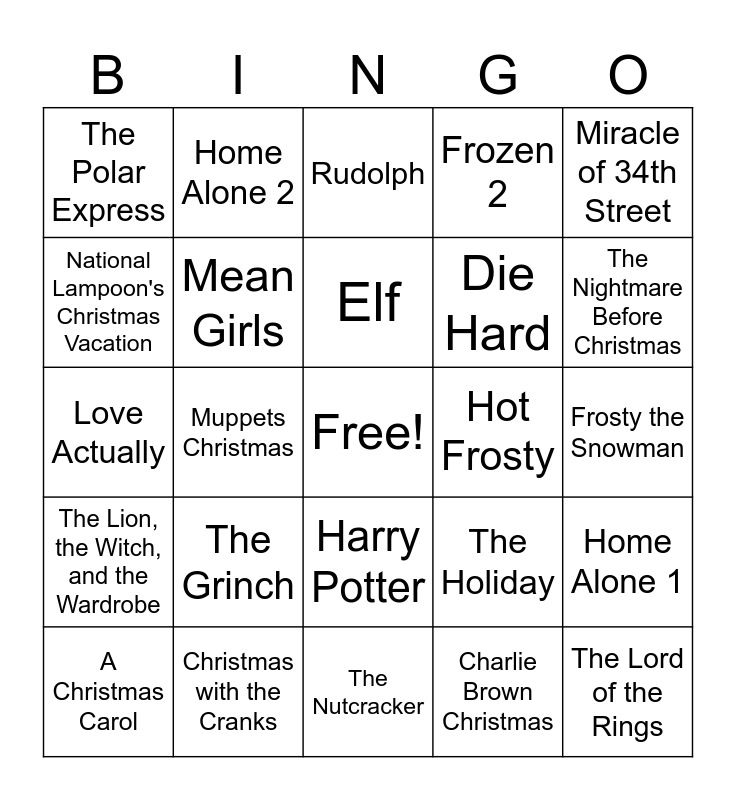 This bingo card has a free space and 24 words: The Grinch, Christmas with the Cranks, Elf, A Christmas Carol, Miracle of 34th Street, The Polar Express, National Lampoon's Christmas Vacation, Home Alone 2, Hot Frosty, Harry Potter, Die Hard, Love Actually, The Holiday, Home Alone 1, Mean Girls, Charlie Brown Christmas, Frosty the Snowman, Rudolph, The Nightmare Before Christmas, Muppets Christmas, The Lord of the Rings, The Lion, the Witch, and the Wardrobe, Frozen 2 and The Nutcracker.