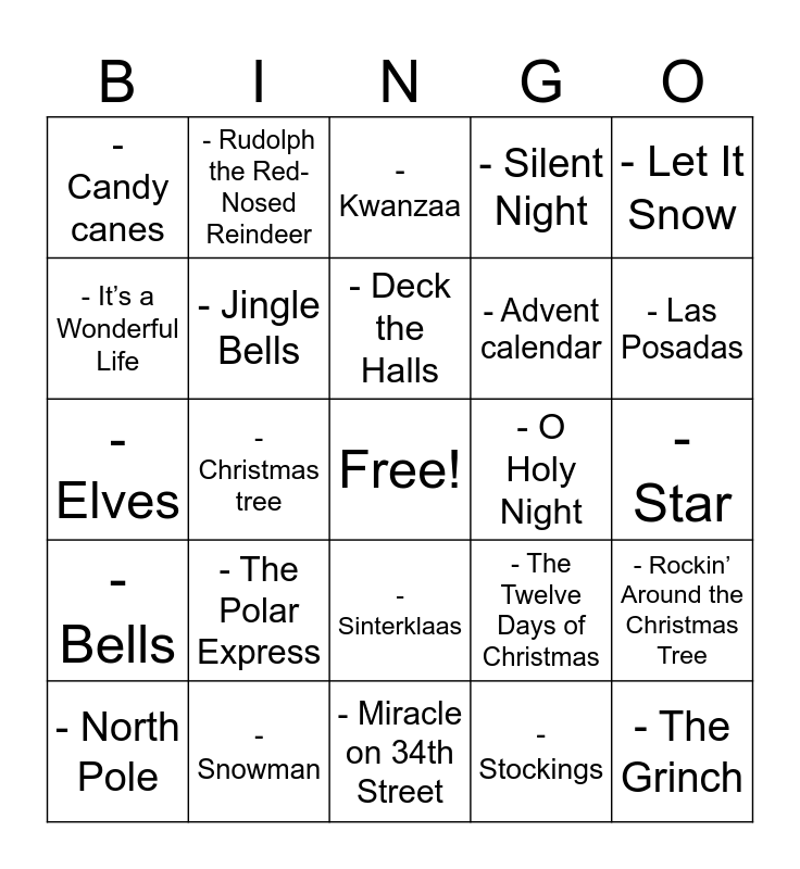 This bingo card has a free space and 50 words: - Home Alone, - The Grinch, - Elf, - Miracle on 34th Street, - The Polar Express, - A Christmas Carol, - Rudolph the Red-Nosed Reindeer, - Frosty the Snowman, - It’s a Wonderful Life, - National Lampoon’s Christmas Vacation, - Jingle Bells, - Silent Night, - Rockin’ Around the Christmas Tree, - The Twelve Days of Christmas, - The Christmas Song, - All I Want for Christmas Is You, - Deck the Halls, - O Holy Night, - Joy to the World, - Let It Snow, - Christmas tree, - Stockings, - Candy canes, - Advent calendar, - Hanukkah menorah, - Dreidel, - Las Posadas, - Yule log, - Kwanzaa, - Sinterklaas, - Santa Claus, - Reindeer, - Sleigh, - Snowflake, - Snowman, - Gingerbread house, - Hot cocoa, - Eggnog, - Mistletoe, - Star, - Fireplace, - Caroling, - Wrapping paper, - Presents, - North Pole, - Elves, - Christmas lights, - Wreath, - Bells and - Candy.