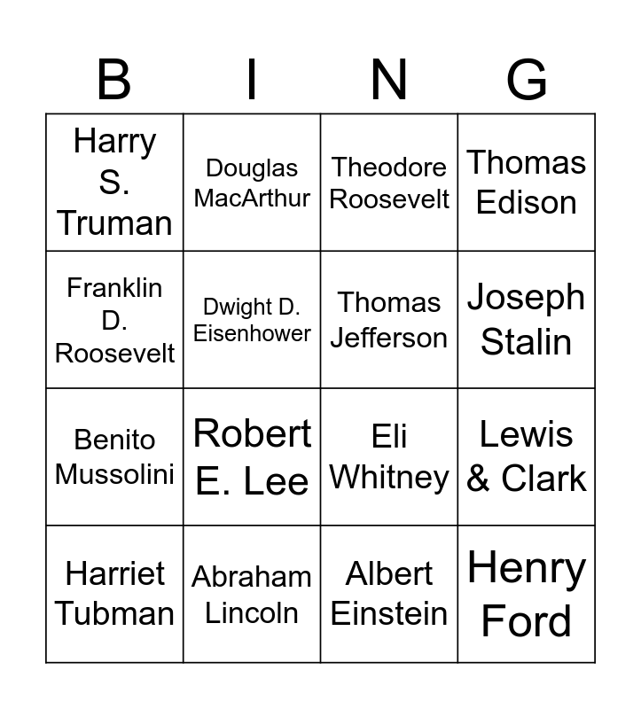 This bingo card has 26 words: Free!, Adolf Hitler, Joseph Stalin, Winston Churchill, Franklin D. Roosevelt, Harry S. Truman, Dwight D. Eisenhower, Douglas MacArthur, Albert Einstein, J. Robert Oppenheimer, Benito Mussolini, Eli Whitney, Paul Revere, Langston Hughes, Lewis & Clark, John D. Rockefeller, Thomas Edison, Henry Ford, Theodore Roosevelt, Harriet Tubman, Robert E. Lee, Ulysses S. Grant, Abraham Lincoln, Andrew Jackson, Thomas Jefferson and George Washington.