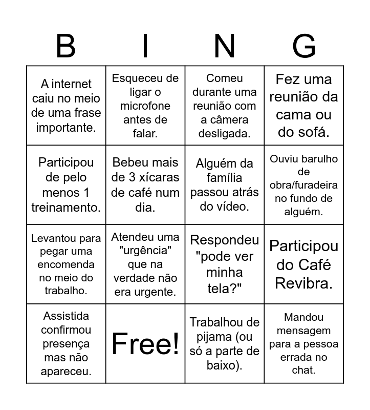 This bingo card has 21 words: Free!, Falou "Você está no mudo" para alguém., Esqueceu de ligar o microfone antes de falar., Pet apareceu na câmera., Trabalhou de pijama (ou só a parte de baixo)., Alguém da família passou atrás do vídeo., A internet caiu no meio de uma frase importante., Comeu durante uma reunião com a câmera desligada., Respondeu "pode ver minha tela?", Ouviu barulho de obra/furadeira no fundo de alguém., Levantou para pegar uma encomenda no meio do trabalho., Fez uma reunião da cama ou do sofá., Mandou mensagem para a pessoa errada no chat., Teve que reiniciar o computador no meio do dia., Bebeu mais de 3 xícaras de café num dia., O computador travou na hora de compartilhar a tela., Assistida confirmou presença mas não apareceu., Atendeu uma "urgência" que na verdade não era urgente., Participou de pelo menos 1 treinamento., Participou do Café Revibra. and Fez mais de 5 atendimentos esse ano..