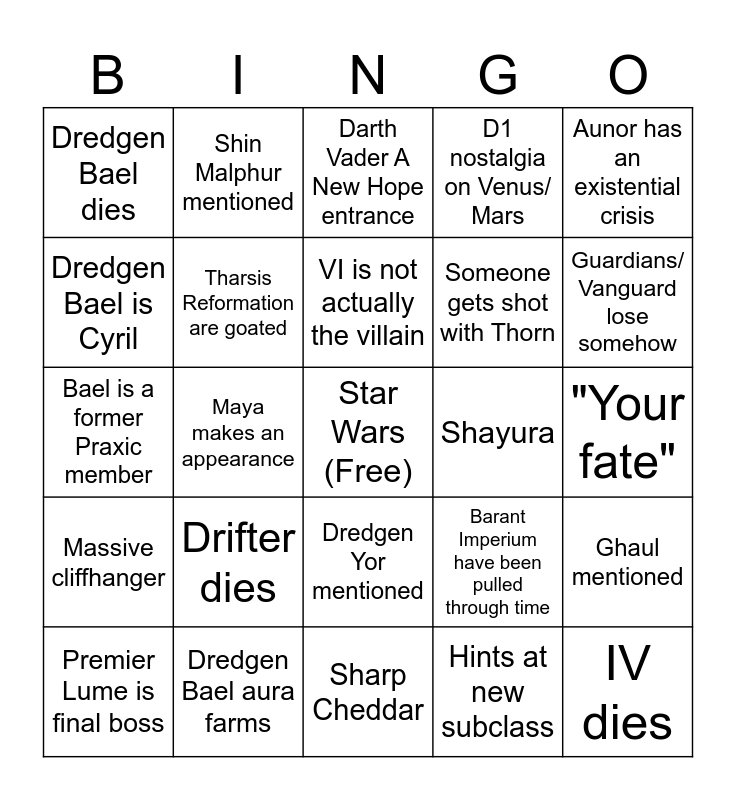 This bingo card has a free space and 24 words: Drifter dies, Dredgen Bael aura farms, VI is not actually the villain, Premier Lume is final boss, Aunor has an existential crisis, Dredgen Bael dies, Dredgen Bael is Cyril, Shin Malphur mentioned, Shayura, Dredgen Yor mentioned, Someone gets shot with Thorn, Bael is a former Praxic member, Barant Imperium have been pulled through time, Ghaul mentioned, Tharsis Reformation are goated, Hints at new subclass, "Your fate", Darth Vader A New Hope entrance, Guardians/ Vanguard lose somehow, Maya makes an appearance, IV dies, Massive cliffhanger, D1 nostalgia on Venus/ Mars and Sharp Cheddar.