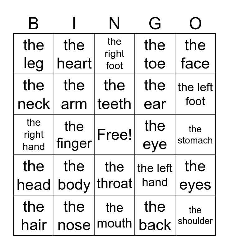 This bingo card has a free space and 24 words: the body, the nose, the teeth, the hair, the face, the leg, the neck, the heart, the eye, the throat, the ear, the right hand, the left hand, the eyes, the arm, the back, the stomach, the right foot, the left foot, the finger, the shoulder, the head, the toe and the mouth.