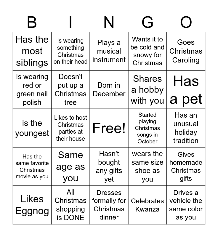 This bingo card has a free space and 24 words: Same age as you, All Christmas shopping is DONE, Born in December, Likes Eggnog, Goes Christmas Caroling, Has the most siblings, Is wearing red or green nail polish, is wearing something Christmas on their head, Started playing Christmas songs in October, Hasn't bought any gifts yet, Shares a hobby with you, is the youngest, wears the same size shoe as you, Gives homemade Christmas gifts, Doesn't put up a Christmas tree, Celebrates Kwanza, Has an unusual holiday tradition, Plays a musical instrument, Has a pet, Likes to host Christmas parties at their house, Drives a vehicle the same color as you, Has the same favorite Christmas movie as you, Wants it to be cold and snowy for Christmas and Dresses formally for Christmas dinner.