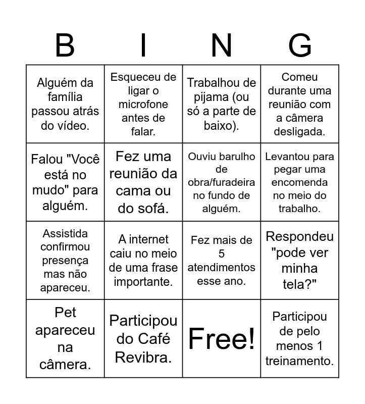 This bingo card has 17 words: Free!, Pet apareceu na câmera., Trabalhou de pijama (ou só a parte de baixo)., Alguém da família passou atrás do vídeo., A internet caiu no meio de uma frase importante., Comeu durante uma reunião com a câmera desligada., Respondeu "pode ver minha tela?", Ouviu barulho de obra/furadeira no fundo de alguém., Levantou para pegar uma encomenda no meio do trabalho., Fez uma reunião da cama ou do sofá., Participou do Café Revibra., Fez mais de 5 atendimentos esse ano., Falou "Você está no mudo" para alguém., Esqueceu de ligar o microfone antes de falar., Assistida confirmou presença mas não apareceu., Atendeu uma "urgência" que na verdade não era urgente. and Participou de pelo menos 1 treinamento..