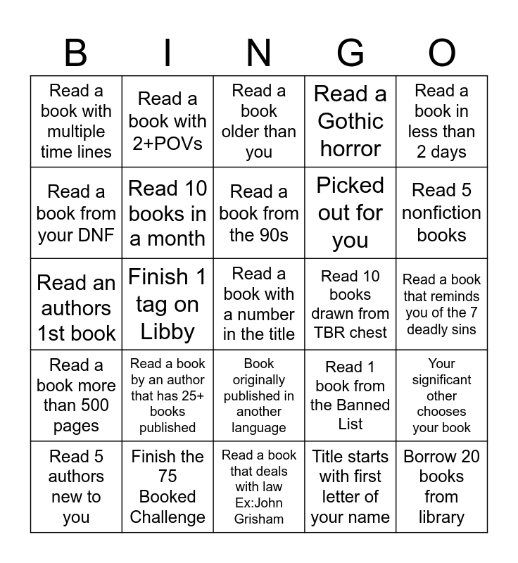 This bingo card has 33 words: Borrow 20 books from library, Start and finish 5 series, Finish 1 tag on Libby, Read a book less than 200 pages, Read a book more than 500 pages, Read 10 books in a month, Read a book in less than 2 days, Read 5 authors new to you, Read a book with 2+POVs, Read a book written in 3rd person, Read a book from the 90s, Read a book older than you, Read a book released in the last 6 months, Read 15 books you already own, Read 10 books drawn from TBR chest, Read 5 nonfiction books, Finish the 75 Booked Challenge, Read an authors 1st book, Read a book by an author that has 25+ books published, Read 1 book from the Banned List, Book originally published in another language, Read a book out of your comfort zone, Read a book with multiple time lines, Read a book that reminds you of the 7 deadly sins, Read a book that deals with law Ex:John Grisham, Read a book with a number in the title, Read a Gothic horror, Picked out for you, Read a book from your DNF, Your significant other chooses your book, A relative that doesn't live you chooses your next book, Title starts with first letter of your name and A book set in the state you live in.