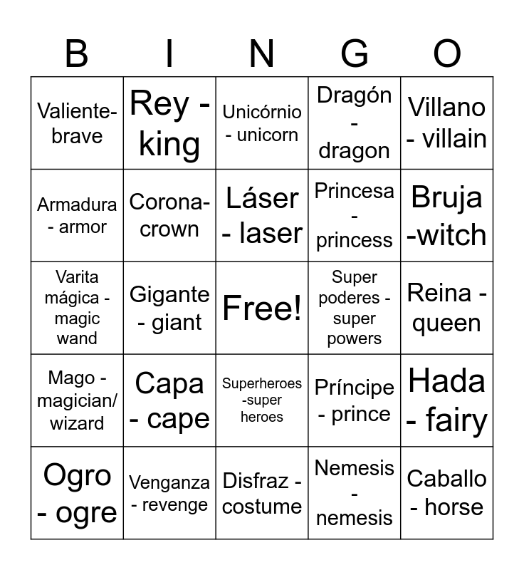 This bingo card has a free space and 26 words: Superheroes -super heroes, Nemesis - nemesis, Láser - laser, Venganza - revenge, Villano - villain, Valiente- brave, Armadura - armor, Rey - king, Reina - queen, Príncipe - prince, Princesa - princess, Varita mágica - magic wand, Hada - fairy, Ogro - ogre, Gigante - giant, Bosque - forest, Dragón - dragon, Mago - magician/ wizard, Unicórnio - unicorn, Caballo - horse, Bruja -witch, Disfraz - costume, Super poderes - super powers, Capa - cape, Corona- crown and Castillo -castle.