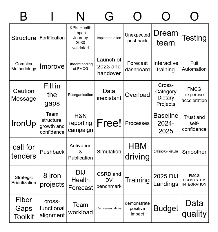 This bingo card has a free space and 48 words: Training, Interactive training, Recommendations, Team structure, growth and confidence, Reorganisation, Trust and self-confidence, Fortification, cross-functional alignment, Dream team, Simulation, Testing, Implementation, Cross-Category Dietary Projects, Overload, Strategic Prioritization, Baseline 2024-2025, Complex Methodology, Full Automation, 2025 DIJ Landings, Unexpected pushback, Forecast dashboard, H&N reporting campaign, Structure, Improve, FMCG ECOSYSTEM INTEGRATION, Understanding of FMCG, FMCG expertise acceleration, Fiber Gaps Toolkit, Data inexistant, Fill in the gaps, Budget, Processes, Smoother, 8 iron projects, IronUp, HBM driving, CATEGORY4HEALTH, Caution Message, Activation & Publication, DIJ Health Forecast, call for tenders, Data quality, KPIs Health Impact Journey 2030 validated, Team workload, Launch of 2023 and handover, CSRD and DV benchmark, Pushback and demonstrate positive impact.