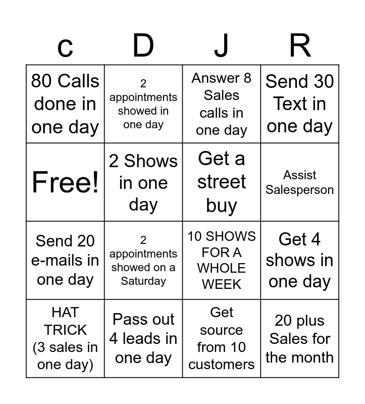 This bingo card has 16 words: Pass out 4 leads in one day, Get 4 shows in one day, Answer 8 Sales calls in one day, 80 Calls done in one day, Send 20 e-mails in one day, 2 appointments showed in one day, 10 SHOWS FOR A WHOLE WEEK, Get source from 10 customers, Free!, 2 Shows in one day, HAT TRICK (3 sales in one day), Send 30 Text in one day, 2 appointments showed on a Saturday, Assist Salesperson, Get a street buy and 20 plus Sales for the month.