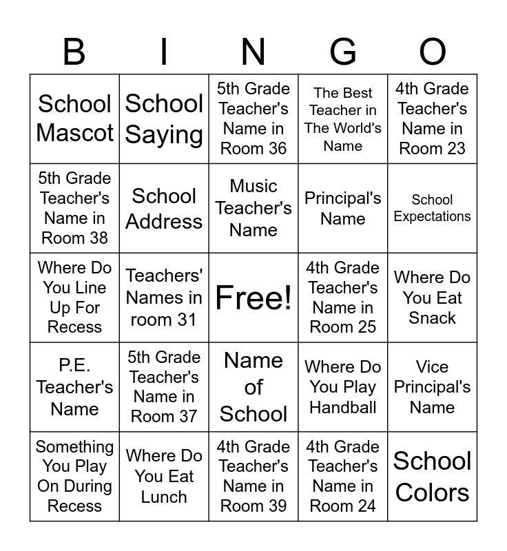 This bingo card has a free space and 24 words: 5th Grade Teacher's Name in Room 37, Where Do You Eat Lunch, Music Teacher's Name, Something You Play On During Recess, 4th Grade Teacher's Name in Room 23, School Mascot, 5th Grade Teacher's Name in Room 38, School Saying, 4th Grade Teacher's Name in Room 25, Name of School, Principal's Name, Where Do You Line Up For Recess, Where Do You Play Handball, Vice Principal's Name, School Address, 4th Grade Teacher's Name in Room 24, Where Do You Eat Snack, 5th Grade Teacher's Name in Room 36, School Expectations, Teachers' Names in room 31, School Colors, P.E. Teacher's Name, The Best Teacher in The World's Name and 4th Grade Teacher's Name in Room 39.