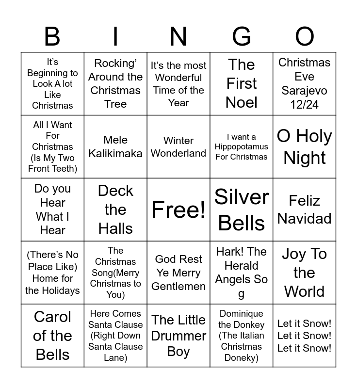 This bingo card has a free space and 29 words: Carol of the Bells, Jingle Bell Rock, Deck the Halls, A Holly Jolly Christmas, It’s Beginning to Look A lot Like Christmas, It’s the most Wonderful Time of the Year, Mele Kalikimaka, The Christmas Song(Merry Christmas to You), Silver Bells, Here Comes Santa Clause (Right Down Santa Clause Lane), Feliz Navidad, Let it Snow! Let it Snow! Let it Snow!, The Little Drummer Boy, Dominique the Donkey (The Italian Christmas Doneky), O Holy Night, Silver and Gold, God Rest Ye Merry Gentlemen, (There’s No Place Like) Home for the Holidays, Christmas Eve Sarajevo 12/24, Do you Hear What I Hear, Hark! The Herald Angels So g, Mary Did You Know?, I want a Hippopotamus For Christmas, All I Want For Christmas (Is My Two Front Teeth), The First Noel, Rocking’ Around the Christmas Tree, Joy To the World, Winter Wonderland and Silent Night.