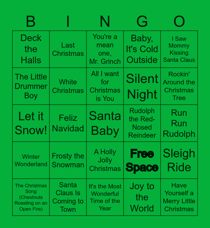 This bingo card has 25 words: Frosty the Snowman, It's the Most Wonderful Time of the Year, All I want for Christmas is You, The Christmas Song (Chestnuts Roasting on an Open Fire), I Saw Mommy Kissing Santa Claus, Deck the Halls, The Little Drummer Boy, Last Christmas, Rudolph the Red-Nosed Reindeer, A Holly Jolly Christmas, Silent Night, Let it Snow!, Free Space, Sleigh Ride, White Christmas, Have Yourself a Merry Little Christmas, Run Run Rudolph, You're a mean one, Mr. Grinch, Rockin' Around the Christmas Tree, Feliz Navidad, Santa Baby, Santa Claus Is Coming to Town, Winter Wonderland, Baby, It's Cold Outside and Joy to the World.