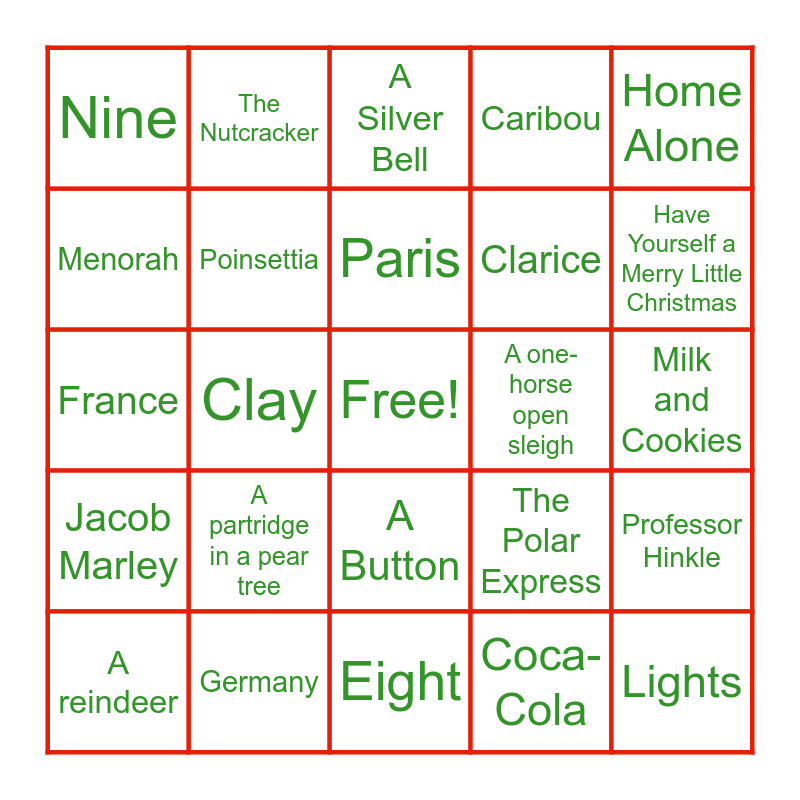 This bingo card has a free space and 34 words: Chicago, Coca-Cola, Candy Canes, Jingle Bells, Jacob Marley, Poinsettia, Home Alone, A reindeer, The Nutcracker, Charles Dickens, Paris, A Silver Bell, Santa Claus is Coming to Town, White Christmas (by Bing Crosby), A one-horse open sleigh, Have Yourself a Merry Little Christmas, Germany, France, A partridge in a pear tree, The Polar Express, A Button, Reindeer Games, Nine, Milk and Cookies, Eight, Lights, Caribou, Max, Clarice, Menorah, Latkes, Clay, Professor Hinkle and A Christmas Story.