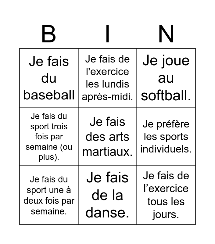 This bingo card has 15 words: Free!, Je joue au football américain., Je joue au softball., Je fais du baseball, Je fais de la danse., Je fais des arts martiaux., Je préfère marcher ou courir., Je préfère les sports collectifs., Je préfère les sports individuels., Je fais de l’exercice tous les jours., Je fais de l’exercice le week-end., Je fais du sport trois fois par semaine (ou plus)., Je fais du sport une à deux fois par semaine., Je fais de l'exercice les lundis après-midi. and Je fais de l'exercice le samedi matin..