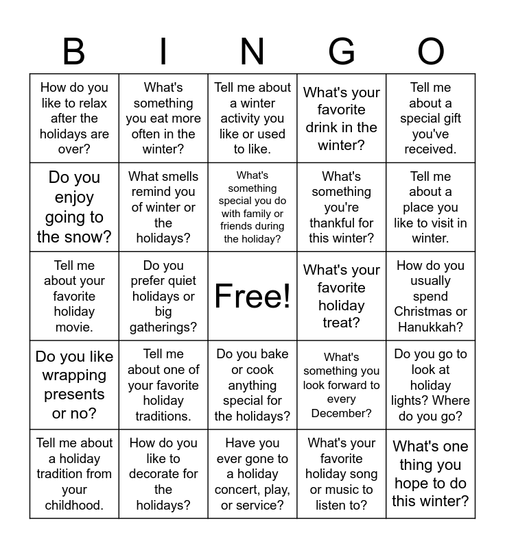 This bingo card has a free space and 24 words: Tell me about one of your favorite holiday traditions., How do you like to decorate for the holidays?, What's something special you do with family or friends during the holiday?, Tell me about a holiday tradition from your childhood., Tell me about a special gift you've received., How do you like to relax after the holidays are over?, Do you enjoy going to the snow?, What's something you eat more often in the winter?, What's your favorite holiday treat?, Do you bake or cook anything special for the holidays?, What's something you're thankful for this winter?, Tell me about your favorite holiday movie., What's something you look forward to every December?, Do you go to look at holiday lights? Where do you go?, What smells remind you of winter or the holidays?, What's your favorite holiday song or music to listen to?, How do you usually spend Christmas or Hanukkah?, Tell me about a winter activity you like or used to like., Tell me about a place you like to visit in winter., Do you prefer quiet holidays or big gatherings?, What's one thing you hope to do this winter?, Do you like wrapping presents or no?, What's your favorite drink in the winter? and Have you ever gone to a holiday concert, play, or service?.