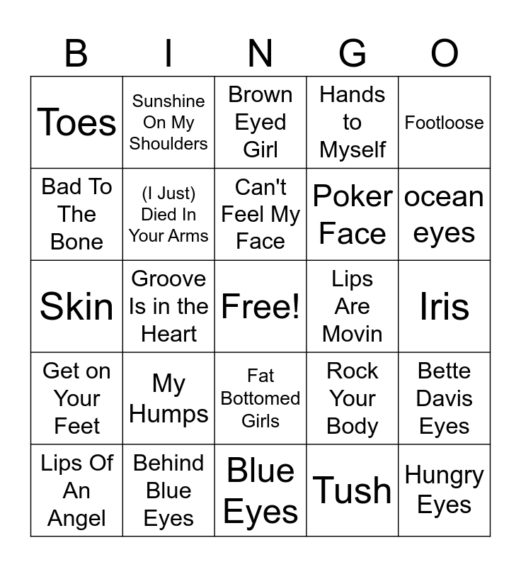 This bingo card has a free space and 40 words: Hips Don't Lie, Skin, Let Me Clear My Throat, (I Just) Died In Your Arms, Behind Blue Eyes, Fat Bottomed Girls, Can't Feel My Face, Drink In My Hand, Footloose, Get on Your Feet, Groove Is in the Heart, Hands to Myself, Hungry Eyes, Iris, Lips Are Movin, My Humps, Private Eyes, Toes, Wrapped Around Your Finger, Brown Eyed Girl, Bette Davis Eyes, Tush, Poker Face, Bad To The Bone, (Shake, Shake, Shake) Shake Your Booty, Heart-Shaped Box, Got My Mind Set On You, Knee Deep, Legs, Heart Of Glass, Tongue Tied, Lips Of An Angel, Baby Got Back, Rock Your Body, ocean eyes, Blue Eyes, Felt Good On My Lips, Head Games, Sunshine On My Shoulders and These Arms of Mine.