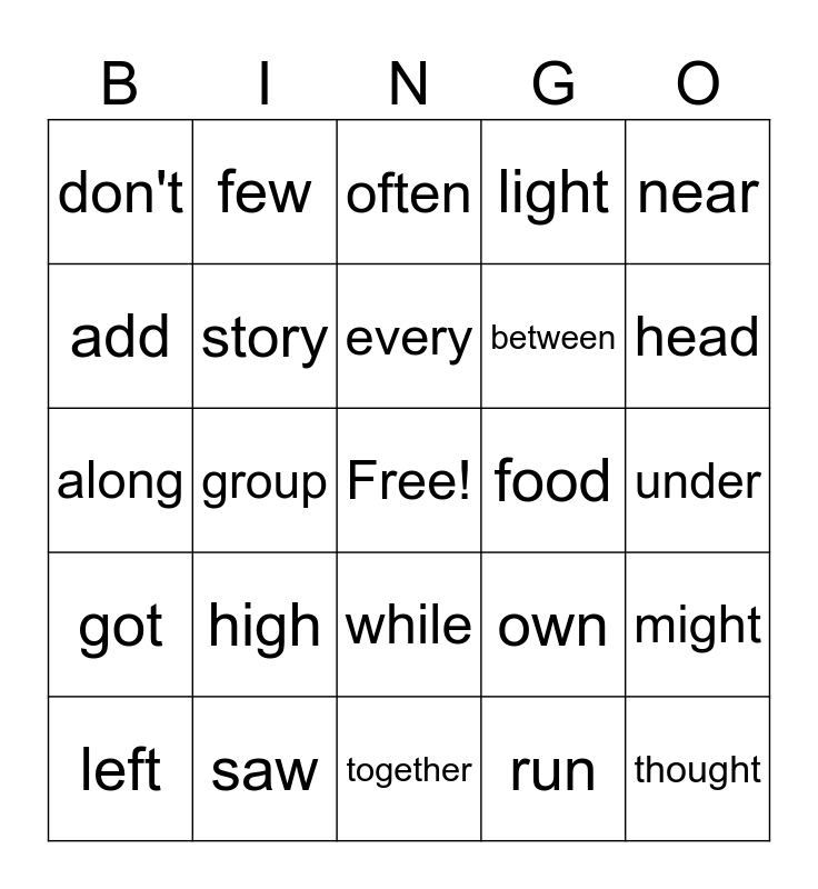 This bingo card has a free space and 24 words: high, saw, every, left, near, don't, add, few, food, while, between, along, own, might, story, run, under, often, head, group, thought, got, light and together.