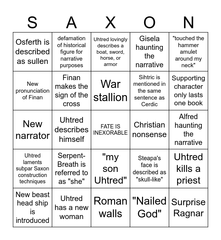 This bingo card has a free space and 24 words: Serpent-Breath is referred to as "she", Uhtred has a new woman, War stallion, New beast head ship is introduced, "touched the hammer amulet around my neck", Osferth is described as sullen, New pronunciation of Finan, defamation of historical figure for narrative purposes, Christian nonsense, "my son Uhtred", Sihtric is mentioned in the same sentence as Cerdic, New narrator, Steapa's face is described as "skull-like", Uhtred kills a priest, Finan makes the sign of the cross, "Nailed God", Alfred haunting the narrative, Uhtred lovingly describes a boat, sword, horse, or armor, Supporting character only lasts one book, Uhtred describes himself, Surprise Ragnar, Uhtred laments subpar Saxon construction techniques, Gisela haunting the narrative and Roman walls.