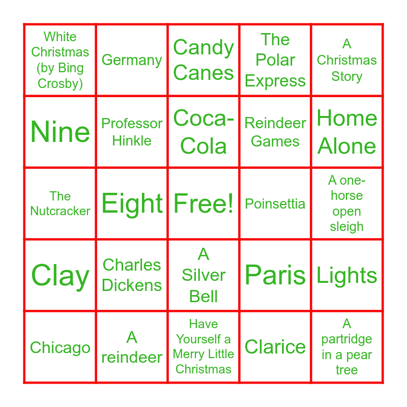 This bingo card has a free space and 34 words: Max, Clarice, Menorah, Latkes, Clay, Professor Hinkle, A Christmas Story, Chicago, Germany, France, Coca-Cola, Candy Canes, Jingle Bells, Jacob Marley, Poinsettia, Home Alone, A reindeer, The Nutcracker, Charles Dickens, Paris, A Silver Bell, Santa Claus is Coming to Town, White Christmas (by Bing Crosby), A one-horse open sleigh, Have Yourself a Merry Little Christmas, A partridge in a pear tree, The Polar Express, A Button, Reindeer Games, Nine, Milk and Cookies, Eight, Lights and Caribou.