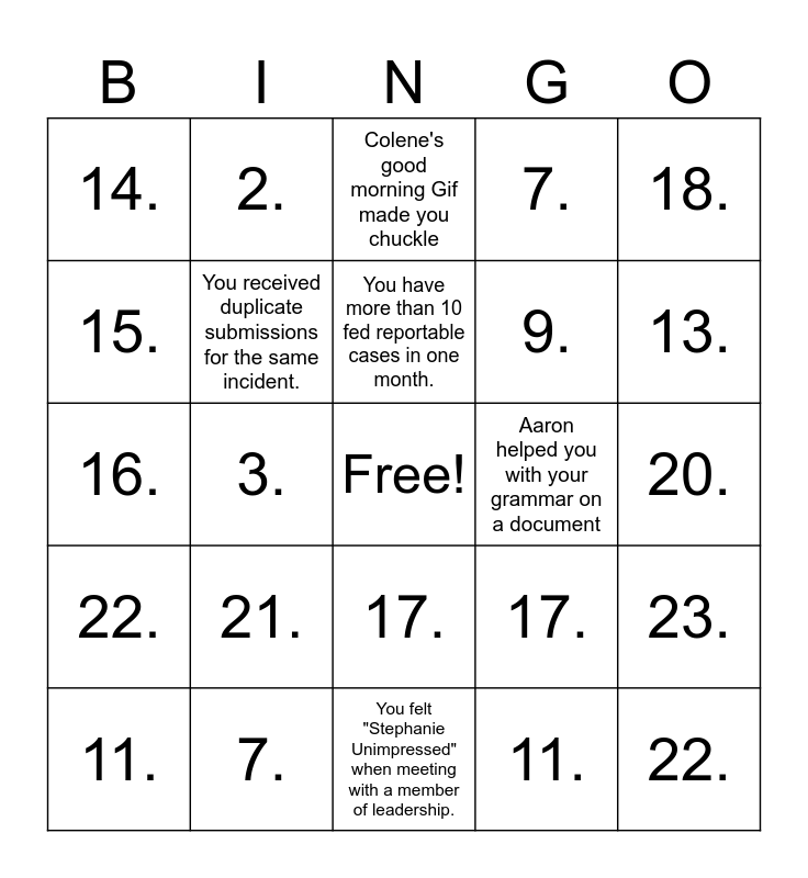 This bingo card has a free space and 72 words: 1., 2., 3., 4., 5., 6., 7., 8., 9., 10., 11., 12., 13., 14., 15., 16., 17., 18., 19., 20., 21., 22., 23., 24., 1., 2., 3., 4., 5., 6., 7., 8., 9., 10., 11., 12., 13., 14., 15., 16., 17., 18., 19., 20., 21., 22., 23., 24., Reassigned a case to Compliance from Privacy, Reassigned a case to SHPS, Celebrity Snooper Case, Your case revealed a bigger department wide problem, Love triangle case, Aaron helped you with your grammar on a document, Emily's good luck helped a case go in your favor, Your case question got a TJ - ism. (wah wah, nothing burger, etc), Colene's good morning Gif made you chuckle, You have more than 10 fed reportable cases in one month., Napoleon got a talking to three times in your Arzo review time, You were able to clear all snooping alerts that came in that day., A Case's disclosed document contained sensitive images, In a two week span you received three cases with the same error (face sheets, hover bubble, twins etc.), You were able to close a case in the initial email., You felt "Stephanie Unimpressed" when meeting with a member of leadership., Leadership had significant trouble interviewing a snooper (interviewed wrong person, staff on vacation, etc.), You get a milestone case number (EP5000, EP5500, EP5555, etc.), You received duplicate submissions for the same incident., You had to speak with leadership directly that their employee was not being honest with them in the interview., You chose the treat for the in-office day., Leadership responded to your initial snooping alert and case opening email in the same day., The employee you gave an excel/kudos too, sent a thank you email. and You learned something new from a Webinar..