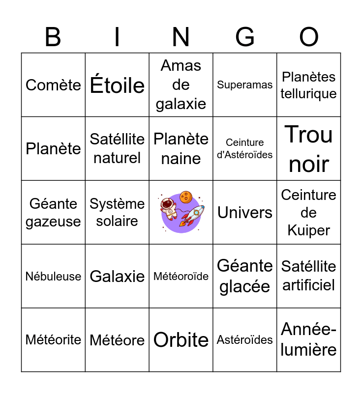 This bingo card has a free space and 24 words: Galaxie, Météore, Planète naine, Météorite, Planètes tellurique, Comète, Planète, Étoile, Univers, Météoroïde, Ceinture d'Astéroïdes, Géante gazeuse, Géante glacée, Satéllite artificiel, Satéllite naturel, Astéroïdes, Ceinture de Kuiper, Amas de galaxie, Trou noir, Système solaire, Année-lumière, Nébuleuse, Superamas and Orbite.