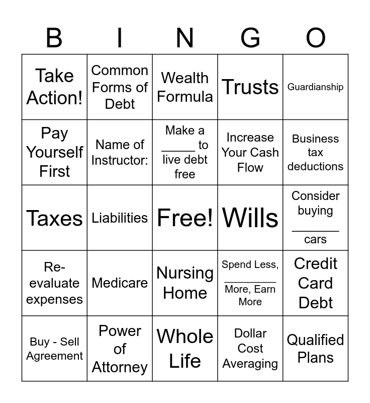 This bingo card has a free space and 43 words: Buy expensive things, Qualified Plans, Simple IRA, Buy - Sell Agreement, Travel Insurance, Dollar Cost Averaging, Wealth Formula, Rule of 72, Guardianship, Power of Attorney, Trusts, Wills, Nursing Home, Medicare, Index Universal Life, Whole Life, Long Term Care, Taxes, Average American Carries a Credit Card Debt Balance over _________ month to month, Business tax deductions, Common Forms of Debt, Monthly Cash Flow, Rules of Credit, Take Action!, Net Worth, Consider buying _______ cars, Are you a creature of habit?, Put the Cash Flow to Work, Spend Less, _________ More, Earn More, Re-evaluate expenses, Debt Roll Up, Credit Card Debt, Assets, Liabilities, Reevaluate where your money is going every _________, Where is your money going?, Save at least ___% of this month's incom, Make a _____ to live debt free, Pay Yourself First, Increase Your Cash Flow, Your Vision, Your Goals, Name of Instructor: and 30x30 Campaign.