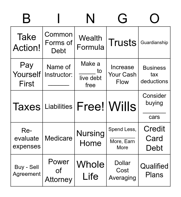 This bingo card has a free space and 43 words: Buy expensive things, Qualified Plans, Simple IRA, Buy - Sell Agreement, Travel Insurance, Dollar Cost Averaging, Wealth Formula, Rule of 72, Guardianship, Power of Attorney, Trusts, Wills, Nursing Home, Medicare, Index Universal Life, Whole Life, Long Term Care, Taxes, Average American Carries a Credit Card Debt Balance over _________ month to month, Business tax deductions, Common Forms of Debt, Monthly Cash Flow, Rules of Credit, Take Action!, Net Worth, Consider buying _______ cars, Are you a creature of habit?, Put the Cash Flow to Work, Spend Less, _________ More, Earn More, Re-evaluate expenses, Debt Roll Up, Credit Card Debt, Assets, Liabilities, Reevaluate where your money is going every _________, Where is your money going?, Save at least ___% of this month's incom, Make a _____ to live debt free, Pay Yourself First, Increase Your Cash Flow, Your Vision, Your Goals, Name of Instructor: ______ and 30x30 Campaign.