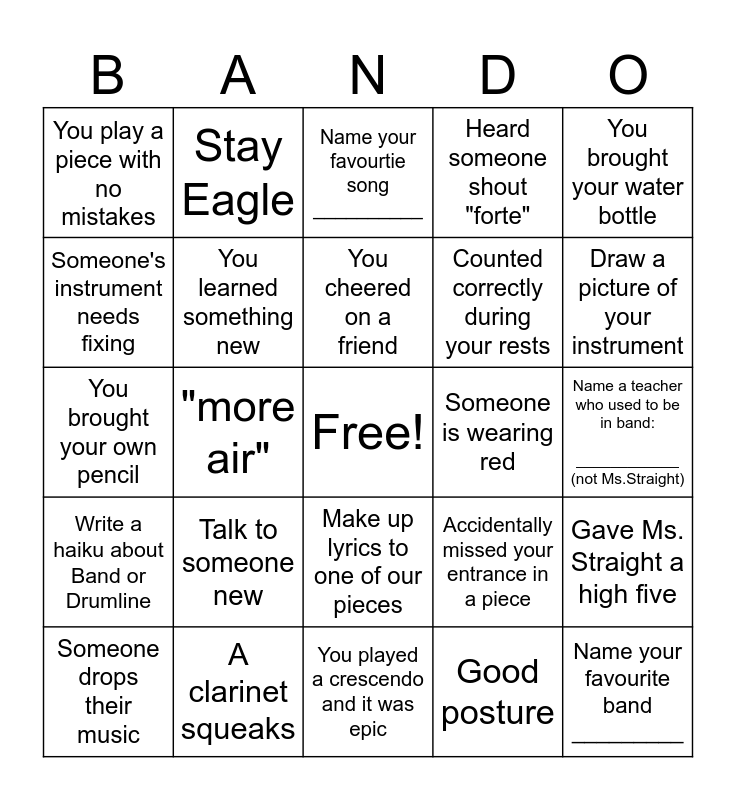 This bingo card has a free space and 24 words: Talk to someone new, A clarinet squeaks, You cheered on a friend, Someone drops their music, You brought your water bottle, You play a piece with no mistakes, Someone's instrument needs fixing, Stay Eagle, Someone is wearing red, Make up lyrics to one of our pieces, Counted correctly during your rests, You brought your own pencil, Accidentally missed your entrance in a piece, Gave Ms. Straight a high five, You learned something new, Good posture, Name a teacher who used to be in band: ____________ (not Ms.Straight), Name your favourtie song __________, Draw a picture of your instrument, "more air", Name your favourite band _________, Write a haiku about Band or Drumline, Heard someone shout "forte" and You played a crescendo and it was epic.