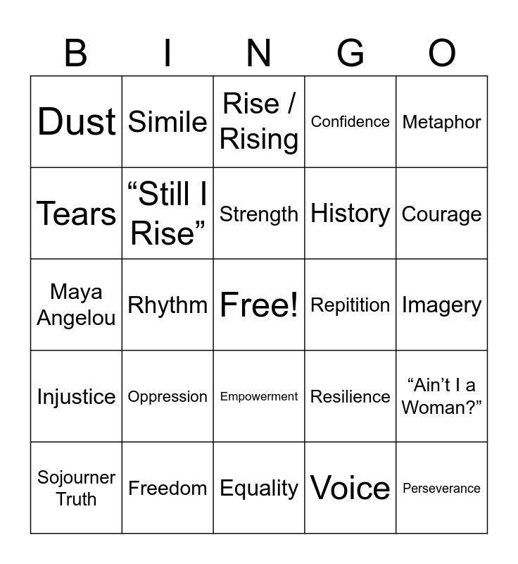 This bingo card has a free space and 24 words: Oppression, Freedom, Strength, Sojourner Truth, Metaphor, Dust, Tears, Simile, Repitition, Empowerment, History, Maya Angelou, Resilience, “Ain’t I a Woman?”, “Still I Rise”, Voice, Imagery, Rise / Rising, Courage, Rhythm, Perseverance, Injustice, Confidence and Equality.