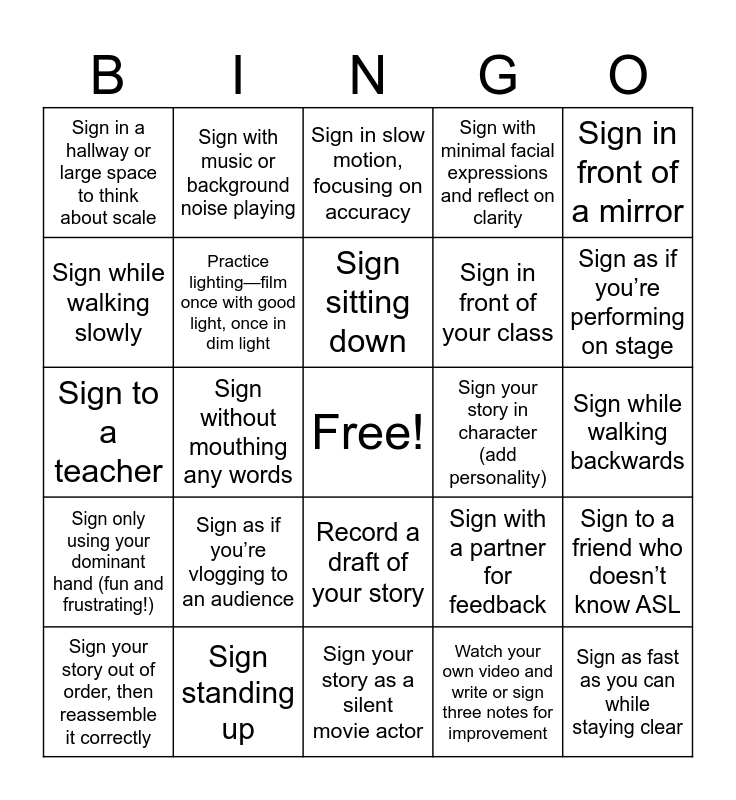 This bingo card has a free space and 26 words: Record a draft of your story, Watch your own video and write or sign three notes for improvement, Sign sitting down, Sign standing up, Sign in front of a mirror, Sign in a hallway or large space to think about scale, Sign while walking slowly, Sign with music or background noise playing, Sign while walking backwards, Sign with a partner for feedback, Sign in front of your class, Sign to a teacher, Sign to a friend who doesn’t know ASL, Sign your story out of order, then reassemble it correctly, Sign without mouthing any words, Sign with exaggerated facial expressions, Sign with minimal facial expressions and reflect on clarity, Sign only using your dominant hand (fun and frustrating!), Sign in slow motion, focusing on accuracy, Sign as fast as you can while staying clear, Sign as if you’re performing on stage, Sign your story as a silent movie actor, Sign your story in character (add personality), Sign as if you’re vlogging to an audience, Practice lighting—film once with good light, once in dim light and Sign while using exaggerated body shifts for role shift.