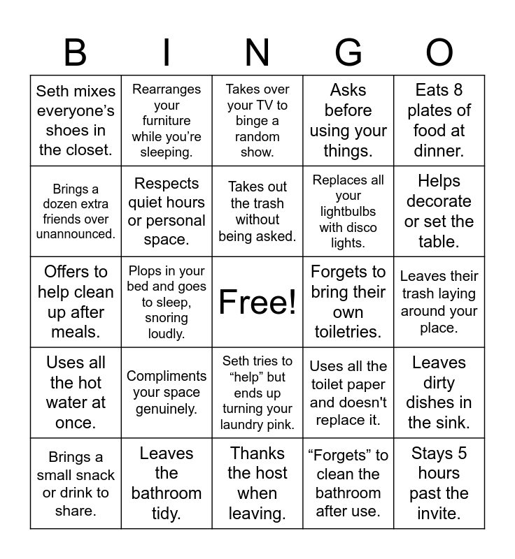 This bingo card has 1 images, a free space and 27 words: Leaves dirty dishes in the sink., Eats the last of your snacks without asking., Replaces all your lightbulbs with disco lights., “Forgets” to clean the bathroom after use., Brings a dozen extra friends over unannounced., Takes over your TV to binge a random show., Rearranges your furniture while you’re sleeping., Uses all the hot water at once., Forgets to bring their own toiletries., Brings a small snack or drink to share., Offers to help clean up after meals., Asks before using your things., Leaves the bathroom tidy., Thanks the host when leaving., Helps decorate or set the table., Offers to drive or help with errands., Compliments your space genuinely., Respects quiet hours or personal space., Takes out the trash without being asked., Seth tries to “help” but ends up turning your laundry pink., Seth mixes everyone’s shoes in the closet., Gets the dog riled up., Stays 5 hours past the invite., Plops in your bed and goes to sleep, snoring loudly., Leaves their trash laying around your place., Uses all the toilet paper and doesn't replace it. and Eats 8 plates of food at dinner..