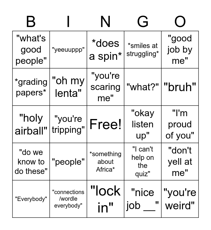 This bingo card has a free space and 24 words: "Everybody", "people", "you're scaring me", "nice job __", "good job by me", "what's good people", "yeeuuppp", *does a spin*, "okay listen up", "I'm proud of you", "holy airball", "oh my lenta", "I can't help on the quiz", "don't yell at me", *grading papers*, "connections /wordle everybody", "lock in", *smiles at struggling*, "bruh", "do we know to do these", "you're tripping", *something about Africa*, "what?" and "you're weird".