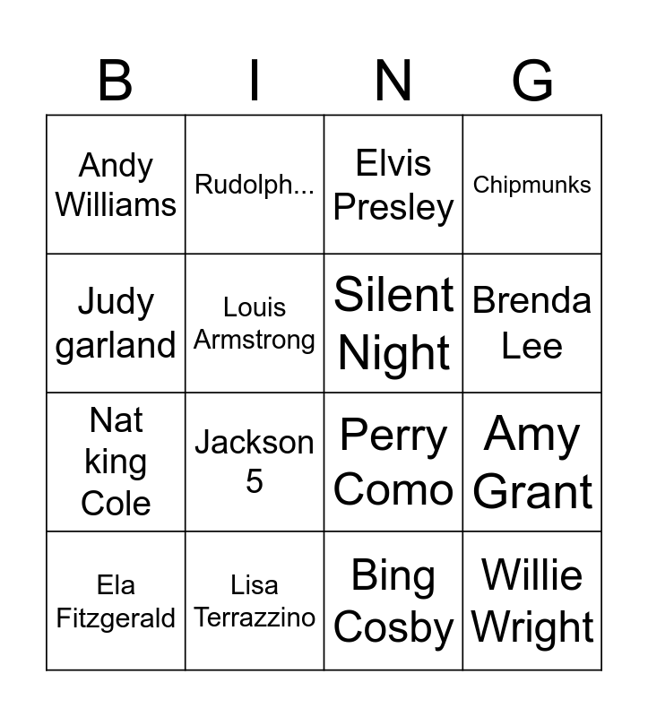 This bingo card has 16 words: Lisa Terrazzino, Amy Grant, Elvis Presley, Andy Williams, Nat king Cole, Rudolph..., Perry Como, Bing Cosby, Judy garland, Louis Armstrong, Ela Fitzgerald, Chipmunks, Jackson 5, Brenda Lee, Silent Night and Willie Wright.