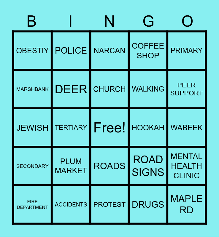This bingo card has a free space and 41 words: WEST BLOOMFIELD, JEWISH, CHALDEAN, DEER, ACCIDENTS, ROADS, CHURCH, SYNAGOGUE, PRIMARY, SECONDARY, TERTIARY, COFFEE SHOP, MAPLE RD, WABEEK, HOOKAH, PLUM MARKET, DEALERSHIP, OBESTIY, STATION 89.3, NARCAN, MENTAL HEALTH CLINIC, HENRY FORD HOSPITAL, PROTEST, WALKING, SCREENINGS, LIFESTYLE MODIFICATIONS, DRUGS, OVERDOSE, PEER SUPPORT, ORCHARD LAKE, HAGGERTY, POLICE, FIRE DEPARTMENT, DETRIOT NEWS, ROAD SIGNS, MARSHBANK, SMOKE, LIBRARY, UPPER CLASS, BUS and ABORTION.