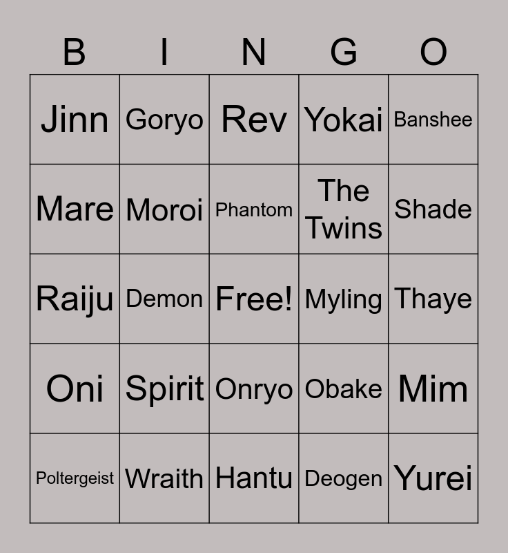 This bingo card has a free space and 24 words: Spirit, Wraith, Phantom, Poltergeist, Banshee, Jinn, Mare, Goryo, Myling, Onryo, The Twins, Raiju, Obake, Mim, Moroi, Deogen, Thaye, Rev, Shade, Demon, Yurei, Oni, Yokai and Hantu.