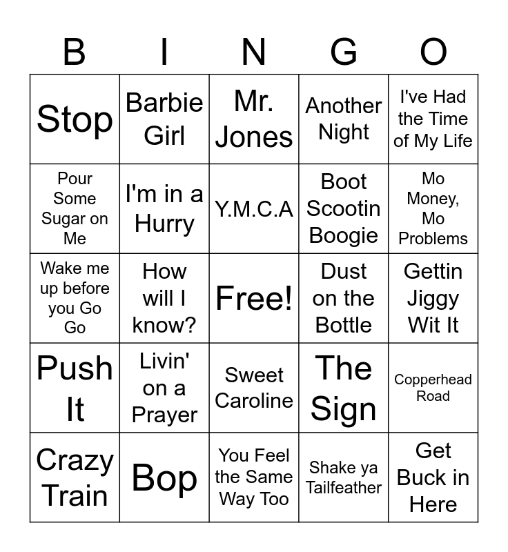 This bingo card has a free space and 24 words: Livin' on a Prayer, Bop, Y.M.C.A, Crazy Train, I've Had the Time of My Life, Stop, Pour Some Sugar on Me, Barbie Girl, Dust on the Bottle, Sweet Caroline, Boot Scootin Boogie, Wake me up before you Go Go, The Sign, Copperhead Road, I'm in a Hurry, Shake ya Tailfeather, Gettin Jiggy Wit It, Mr. Jones, Mo Money, Mo Problems, How will I know?, Get Buck in Here, Push It, Another Night and You Feel the Same Way Too.