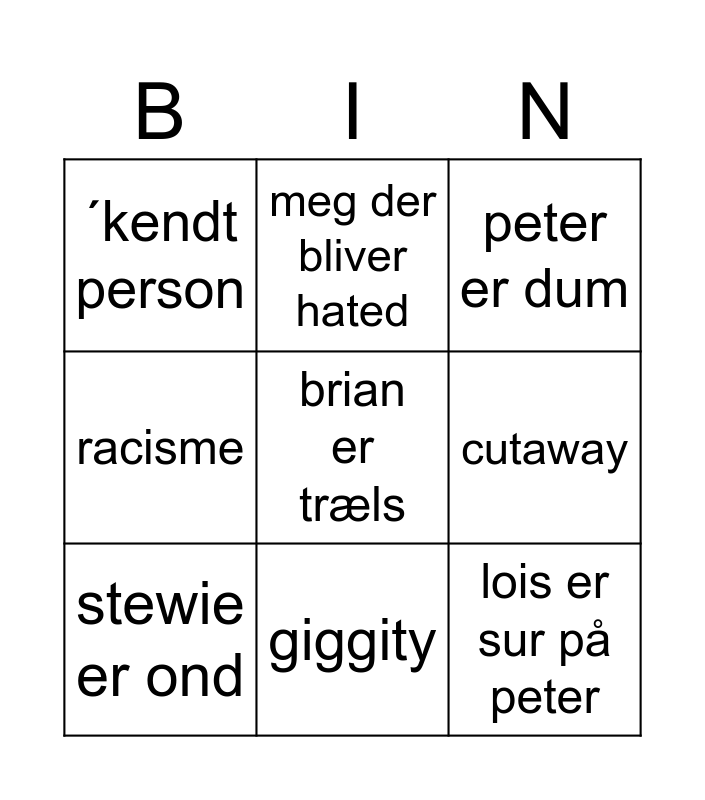 This bingo card has a free space and 8 words: cutaway, peter er dum, meg der bliver hated, stewie er ond, ´kendt person, lois er sur på peter, racisme and giggity.