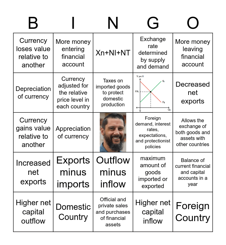 This bingo card has 1 images, a free space and 23 words: Exports minus imports, Domestic Country, Taxes on imported goods to protect domestic production, Higher net capital outflow, More money leaving financial account, Currency loses value relative to another, Depreciation of currency, More money entering financial account, Foreign demand, interest rates, expectations, and protectionist policies, Outflow minus inflow, Currency gains value relative to another, maximum amount of goods imported or exported, Balance of current financial and capital accounts in a year, Currency adjusted for the relative price level in each country, Higher net capital inflow, Allows the exchange of both goods and assets with other countries, Xn+NI+NT, Decreased net exports, Appreciation of currency, Foreign Country, Increased net exports, Exchange rate determined by supply and demand and Official and private sales and purchases of financial assets.