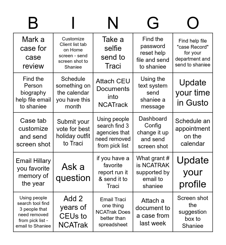 This bingo card has a free space and 24 words: Ask a question, Add 2 years of CEUs to NCATrak, Attach CEU Documents into NCATrack, Using people search tool find 3 people that need removed from pick list - email to Shaniee, Find help file "case Record" for your department and send to shaniee, Mark a case for case review, Find the Person biography help file email to shaniee, Customize Client list tab on Home screen - send screen shot to Shaniee, Dashboard Config change it up and send screen shot, if you have a favorite report run it & send it to Traci, Using the text system send shaniee a message, Case tab customize and send screen shot, What grant # is NCATRAK supported by email to shaniee, Update your profile, Schedule something on the calendar you have this month, Attach a document to a case from last week, Schedule an appointment on the calendar, Take a selfie send to Traci, Update your time in Gusto, Submit your vote for best holiday outfit to Traci, Screen shot the suggestion box to Shaniee, Email Hillary you favorite memory of the year, Find the password reset help file and send to shaniee and Email Traci one thing NCATrak Does better than spreadsheet.