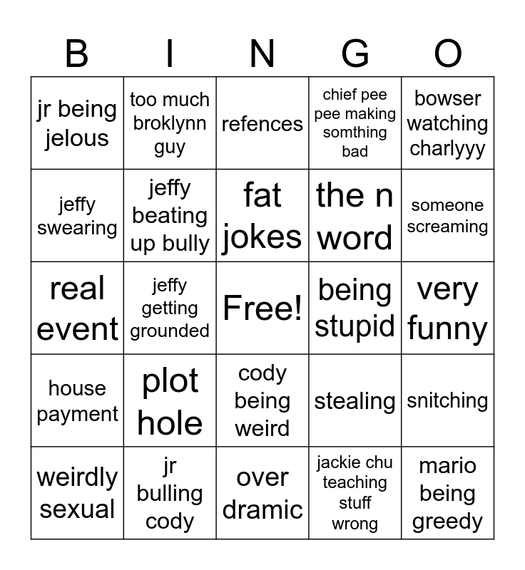 This bingo card has a free space and 24 words: plot hole, jr bulling cody, fat jokes, weirdly sexual, bowser watching charlyyy, jr being jelous, jeffy swearing, too much broklynn guy, being stupid, cody being weird, the n word, real event, stealing, snitching, jeffy beating up bully, jackie chu teaching stuff wrong, very funny, refences, someone screaming, jeffy getting grounded, mario being greedy, house payment, chief pee pee making somthing bad and over dramic.