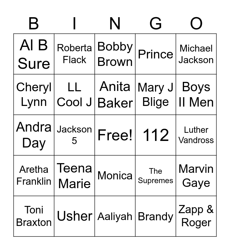 This bingo card has a free space and 36 words: TLC, SWV, James Brown, LL Cool J, The Supremes, Aretha Franklin, Anita Baker, Whitney Houston, Michael Jackson, Janet Jackson, Jackson 5, Prince, New Edition, 112, Boys II Men, Al B Sure, Isley Brothers, Teena Marie, Zapp & Roger, Bobby Brown, Luther Vandross, Marvin Gaye, Usher, Toni Braxton, Aaliyah, Roberta Flack, Andra Day, K. Michelle, Mary J Blige, Cheryl Lynn, The Temptations, O'Jays, Brandy, Monica, Cameo and Beyonce'.