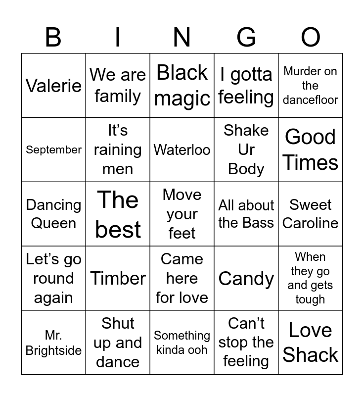 This bingo card has 44 words: Free!, Move your feet, 9 to 5, Mr. Brightside, Uptown Funk, Can’t stop the feeling, Black magic, Happy, Murder on the dancefloor, Shut up and dance, I gotta feeling, All about the Bass, Came here for love, Timber, Dance With me tonight, Something kinda ooh, Rather be, Dancing Queen, Blame it on the boogie, Good Times, We are family, The grease Megamix, Cha-cha slide, Valerie, Ain’t no stopping us now, Sweet Caroline, Lost in music, Thinking of you, Candy, Let’s go round again, I found lovin’, When they go and gets tough, Love come down, Can you feel it, The best, Give me the night, The one and only, Love Shack, Waterloo, September, Shake Ur Body, Mind blown, It’s raining men and Re-Rewind.