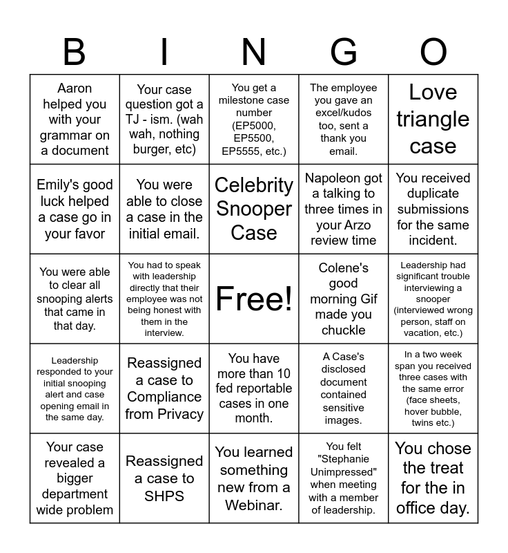 This bingo card has a free space and 24 words: Reassigned a case to Compliance from Privacy, Reassigned a case to SHPS, Celebrity Snooper Case, Your case revealed a bigger department wide problem, Love triangle case, Aaron helped you with your grammar on a document, Emily's good luck helped a case go in your favor, Your case question got a TJ - ism. (wah wah, nothing burger, etc), Colene's good morning Gif made you chuckle, You have more than 10 fed reportable cases in one month., Napoleon got a talking to three times in your Arzo review time, You were able to clear all snooping alerts that came in that day., A Case's disclosed document contained sensitive images., In a two week span you received three cases with the same error (face sheets, hover bubble, twins etc.), You were able to close a case in the initial email., You felt "Stephanie Unimpressed" when meeting with a member of leadership., Leadership had significant trouble interviewing a snooper (interviewed wrong person, staff on vacation, etc.), You get a milestone case number (EP5000, EP5500, EP5555, etc.), You received duplicate submissions for the same incident., You had to speak with leadership directly that their employee was not being honest with them in the interview., You chose the treat for the in office day., Leadership responded to your initial snooping alert and case opening email in the same day., The employee you gave an excel/kudos too, sent a thank you email. and You learned something new from a Webinar..