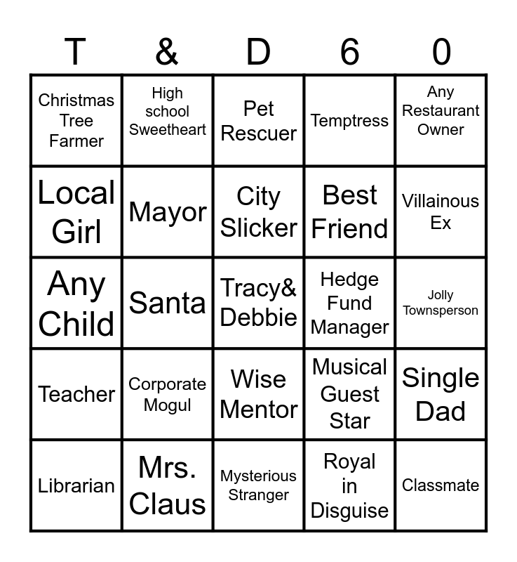 This bingo card has a free space and 24 words: Corporate Mogul, Mrs. Claus, City Slicker, Librarian, Any Restaurant Owner, Christmas Tree Farmer, Local Girl, High school Sweetheart, Hedge Fund Manager, Wise Mentor, Best Friend, Any Child, Musical Guest Star, Single Dad, Mayor, Royal in Disguise, Jolly Townsperson, Pet Rescuer, Villainous Ex, Santa, Classmate, Teacher, Temptress and Mysterious Stranger.