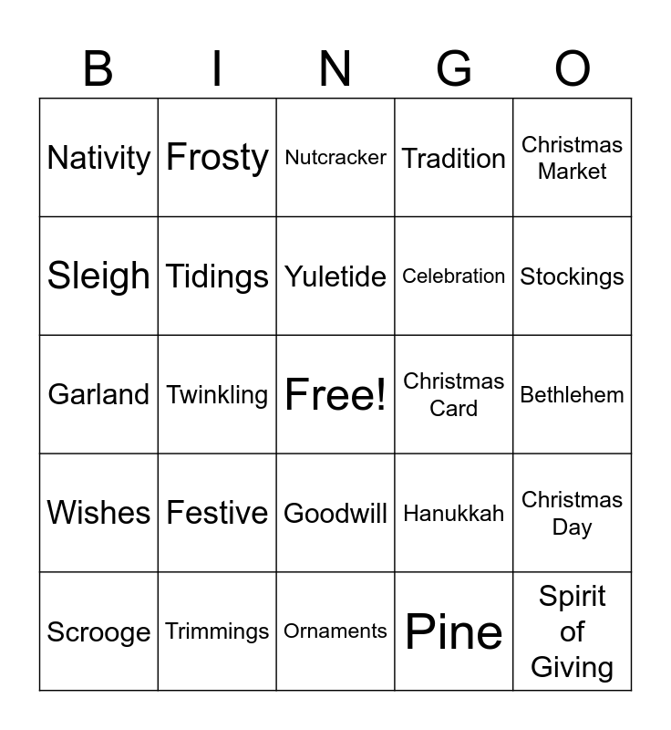 This bingo card has a free space and 98 words: Advent, Angel, Bells, Bethlehem, Candles, Caroling, Chestnuts, Christ, Christmas, Christmas Tree, Eggnog, Elf, Epiphany, Festive, Frankincense, Frosty, Garland, Gifts, Gingerbread, Holly, Icicles, Jingle, Jolly, Manger, Merry, Nativity, Ornaments, Poinsettia, Reindeer, Santa Claus, Scrooge, Sleigh, Snowflakes, Snowman, Stockings, Tinsel, Tradition, Tree Topper, Twinkling, Wreath, Yule, Yuletide, Celebration, Family, Feast, Goodwill, Hope, Joy, Kindness, Love, Peace, Reflection, Sharing, Spirit, Togetherness, Warmth, Wishes, Wonder, Zest, Baubles, Carols, Chimney, Cocoa, December, Elves, Frost, Holiday, Lights, Mistletoe, North Pole, Nutcracker, Partridge, Pine, Polar Express, Presents, Rejoice, Sledding, Snow, Solstice, Spirit of Giving, Tannenbaum, Tidings, Trimmings, Twas the Night, Winter, Wish List, Yule Log, Christmas Eve, Christmas Day, Boxing Day, Kwanzaa, Hanukkah, New Year, Holiday Cheer, Christmas Card, Holiday Lights, Christmas Market and Secret Santa.