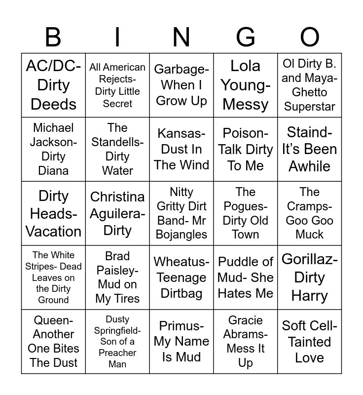 This bingo card has 25 words: Brad Paisley- Mud on My Tires, Primus- My Name Is Mud, Kansas- Dust In The Wind, Queen- Another One Bites The Dust, Ol Dirty B. and Maya- Ghetto Superstar, AC/DC- Dirty Deeds, Michael Jackson- Dirty Diana, All American Rejects- Dirty Little Secret, The Pogues- Dirty Old Town, Wheatus- Teenage Dirtbag, Poison- Talk Dirty To Me, Dirty Heads- Vacation, Puddle of Mud- She Hates Me, Gorillaz- Dirty Harry, The Standells- Dirty Water, Soft Cell- Tainted Love, The Cramps- Goo Goo Muck, Garbage- When I Grow Up, Staind- It’s Been Awhile, Christina Aguilera- Dirty, Nitty Gritty Dirt Band- Mr Bojangles, Dusty Springfield- Son of a Preacher Man, The White Stripes- Dead Leaves on the Dirty Ground, Lola Young- Messy and Gracie Abrams- Mess It Up.