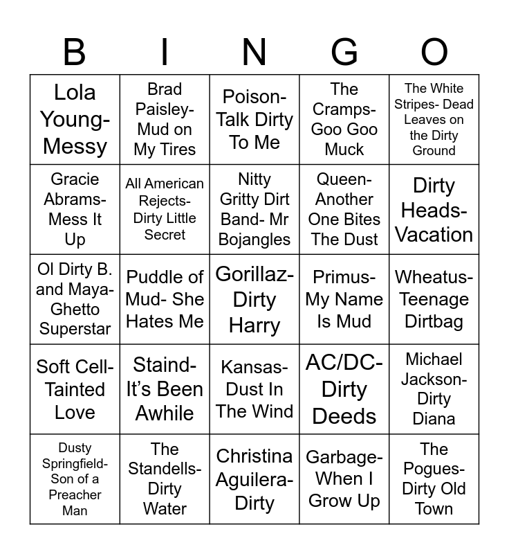 This bingo card has 25 words: Staind- It’s Been Awhile, Christina Aguilera- Dirty, Nitty Gritty Dirt Band- Mr Bojangles, Dusty Springfield- Son of a Preacher Man, The White Stripes- Dead Leaves on the Dirty Ground, Lola Young- Messy, Gracie Abrams- Mess It Up, Brad Paisley- Mud on My Tires, Primus- My Name Is Mud, Kansas- Dust In The Wind, Queen- Another One Bites The Dust, Ol Dirty B. and Maya- Ghetto Superstar, AC/DC- Dirty Deeds, Michael Jackson- Dirty Diana, All American Rejects- Dirty Little Secret, The Pogues- Dirty Old Town, Wheatus- Teenage Dirtbag, Poison- Talk Dirty To Me, Dirty Heads- Vacation, Puddle of Mud- She Hates Me, Gorillaz- Dirty Harry, The Standells- Dirty Water, Soft Cell- Tainted Love, The Cramps- Goo Goo Muck and Garbage- When I Grow Up.