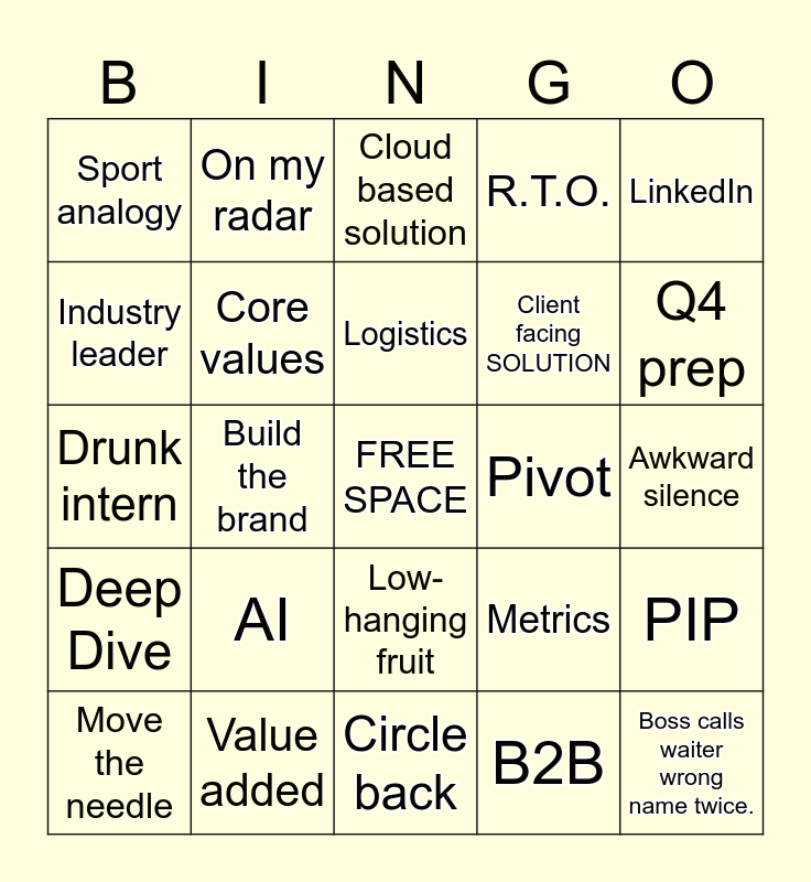 This bingo card has a free space and 49 words: Q4, Boss calls waiter wrong name twice., Hipster bartender sets something on fire, Circle back, AI, Future proof, On my radar, Disruption, Industry leader, Deep dive, Core values, R.T.O., PIP, Metrics, Unique opportunity, Analytics, Logistics, Pivot, Awkward fork drop, LinkedIn, Build the brand, B2B, Sport analogy, Client facing SOLUTION, Circle back, Q4 prep, Move the needle, Out of pocket, Low-hanging fruit, Deep Dive, AI, Synergy, Awkward fork drop, Analytics, Value added, Mispronounce main course, FREE SPACE, Boss calls waiter by wrong name twice, Awkward silence, Sports analogy, Q3 Leadup, Monetization, Metrics, Impressions, Drunk intern, Cloud based solution, Client facing, Lead Generation and "wait-you go first".