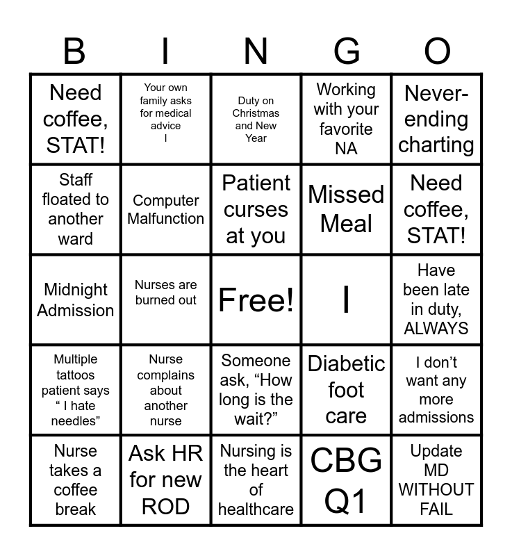 This bingo card has a free space and 155 words: Nurses Upset about schedule, Missed canulation because pt. wiggled, Nursing is a work of heart, Patient brings entire family to stay, Nurse takes a coffee break, Infusion pump beeps Q15, Patient is febrile thru out shift, Nurses are patient people, Patient complains about another nurse, Critical Thinking, Nursing is the heart of healthcare, “This is so frustrating” as verbalized by MD, Midnight Admission, Internet lost connection, Staff floated to another ward, Patient curses at you, Code Blue, Caught someone crying in the pantry, Unit fully staffed, Working with your bestie, Computer Malfunction, Patient eating while on NPO, Waiting for meds from pharmacy, Discharged that takes a whole shift, Celebrity patient in the ward, Restraints needed to patient, Nurses are burned out, When you just want to scream and laugh at the same time, Air-condition is not working, Patient’s bed won’t go down, Asked to work overtime, Update MD WITHOUT FAIL, Shortage of BP cuff at ICU, Nurses being yelled because of remote control, NOD is MGH, STAT, CBG q1, but the patient is eating, I and O monitoring quantitatively, No extra pillow, I don’t want any more admissions, Patient chart is missing, Multiple tattoos patient says “ I hate needles”, Night shifter Nurses, Caught patient smoking in bathroom, Relatives keeps on comparing nurses to other hospital, 20/10 Pain scale, Diabetic foot care, No extra IV pumps or poles, Blockbuster Admissions, Empty linen cabinet, Non stop telephone calls, Patient says, “nurses are stupid” Simultaneous code, STAT imaging but tech is on lunch break, Forgot to remove dentures and nail polish before surgery, Your own family asks for medical advice l, Administered Water Enema, Working with your favorite NA, Nurses Rock!, Questioned by MD on initiating CPR, Bedside Manner, VS monitoring Q1 in the ward, Flat on bed, Have been late in duty, ALWAYS, Patient falls at the end of the shift, Missed Meal, Someone ask, “How long is the wait?”, Being yelled because of Incomplete diet list, Duty on Christmas and New Year, Q2 turning, We can’t cure stupid, but we can sedate it, Need coffee, STAT!, Patient is febrile thru out shift, Ask HR for new ROD Never-ending charting, Nurse complains about another nurse, CBG Q1, Never-ending charting, B, Nurses Upset about schedule, Infusion pump beeps Q15, Nursing is the heart of healthcare, Staff floated to another ward, Working with your bestie, Celebrity patient in the ward, Patient’s bed won’t go down, NOD is MGH, STAT, Patient chart is missing, 20/10 Pain scale, Non stop telephone calls, Administered Water Enema, VS monitoring Q1 in the ward, Someone ask, “How long is the wait?”, Need coffee, STAT!, I, Missed canulation because pt. wiggled, Patient is febrile thru out shift, “This is so frustrating” as verbalized by MD, Patient curses at you, Computer Malfunction, Patient says, “nurses are stupid”, Simultaneous code, Working with your favorite NA, Flat on bed, Being yelled because of Incomplete diet list, Restraints needed to patient, Asked to work overtime, CBG q1, but the patient is eating, Multiple tattoos patient says “ I hate needles”, Diabetic foot care, N, Nursing is a work of heart, Nurses are patient people, Code Blue, Patient eating while on NPO, Night shifter Nurses, No extra IV pumps or poles, STAT imaging but tech is on lunch break, Nurses Rock!, Have been late in duty, ALWAYS, Duty on Christmas and New Year, Ask HR for new ROD, Never-ending charting, Nurses are burned out, Update MD WITHOUT FAIL, I and O monitoring quantitatively, G, Patient brings entire family to stay, Patient complains about another nurse, Midnight Admission, Caught someone crying in the pantry, Waiting for meds from pharmacy, When you just want to scream and laugh at the same time, Shortage of BP cuff at ICU, No extra pillow, Caught patient smoking in bathroom, Blockbuster Admissions, Forgot to remove dentures and nail polish before surgery, Questioned by MD on initiating CPR, Patient falls at the end of the shift, Q2 turning, Nurse complains about another nurse, O, Nurse takes a coffee break, Nursing is the heart of healthcare, Internet lost connection, Unit fully staffed, Discharged that takes a whole shift, Air-condition is not working, Nurses being yelled because of remote control, I don’t want any more admissions, Relatives keeps on comparing nurses to other hospital, Empty linen cabinet, Your own family asks for medical advice, Bedside Manner, Missed Meal, We can’t cure stupid, but we can sedate it and CBG Q1.