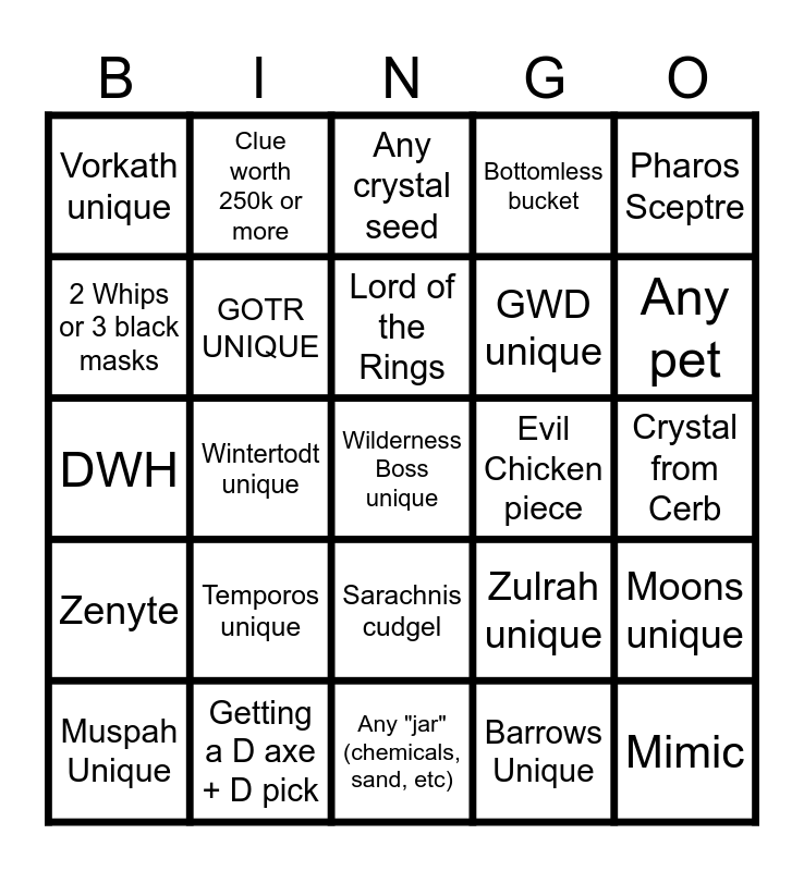 This bingo card has a free space and 25 words: Muspah Unique, Temporos unique, Lord of the Rings, Barrows Unique, Any pet, Vorkath unique, Clue worth 250k or more, Any crystal seed, GWD unique, Moons unique, DWH, GOTR UNIQUE, Zulrah unique, Mimic, 2 Whips or 3 black masks, Getting a D axe + D pick, Any "jar" (chemicals, sand, etc), Bottomless bucket, Crystal from Cerb, Zenyte, Wintertodt unique, Sarachnis cudgel, Evil Chicken piece, Pharos Sceptre and zalcano shard.